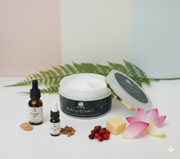 Glowing Goodess is your everyday brightening and hydrating face cream, designed to bring out your skin’s natural radiance. Enriched with Mulberry and Lotus extracts, it works to reduce dark spots, minor blemishes, and uneven tone while delivering long-lasting hydration.